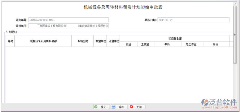 機械設(shè)備及周轉(zhuǎn)材料租賃計劃初始審批表用于控制機械或周轉(zhuǎn)料的租賃數(shù)量,對租賃合同與租賃合同變更中的數(shù)量進行控制。一個項目只能有一個機械數(shù)量計劃初始,當初始的數(shù)量不夠時,可以通過機械(周轉(zhuǎn)材料)租賃計劃補充進行補充和新增。