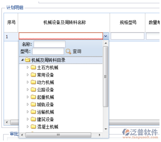 1. 機械設(shè)備及周轉(zhuǎn)料名稱:點擊下拉框,列表里面列出機械目錄字典中的所有機械,如下圖: