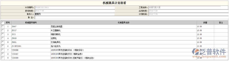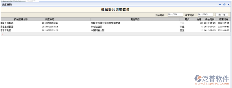 調(diào)度查詢是查詢所有項目所使用的機械器具設備。登錄項目管理系統(tǒng),點擊功能菜單,設備管理->設備調(diào)度->調(diào)度查詢,系統(tǒng)轉(zhuǎn)入調(diào)度查詢界面,系統(tǒng)瀏覽窗口如下圖: