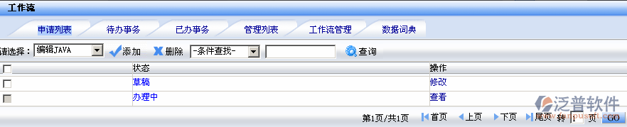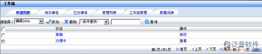 員工點(diǎn)擊功能菜單上的輔助辦公→工作流,然后單擊按鈕,即可進(jìn)入“工作流申請(qǐng)列表”查詢(xún)顯示頁(yè)面: