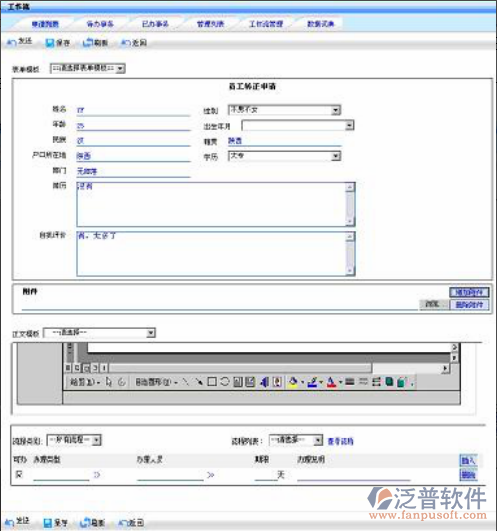 該表單必須預(yù)先由工作流管理員導(dǎo)入,用戶(hù)可在此填寫(xiě)申請(qǐng)表單的內(nèi)容,如申請(qǐng)日期、部門(mén)、職務(wù)、姓名、申請(qǐng)事項(xiàng)、事由等。