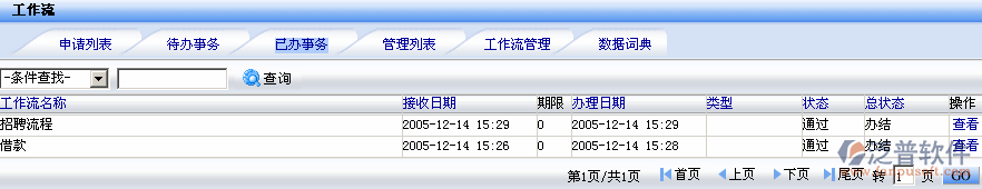 點(diǎn)擊按鈕可按查詢(xún)條件(工作流名稱(chēng)、接收日期、辦理類(lèi)型、期限)顯示當(dāng)前用戶(hù)已經(jīng)處理過(guò)的工作流申請(qǐng)。