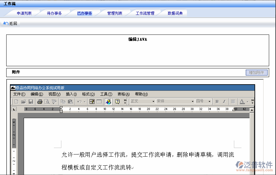 Ø 工作流管理員:可以根據(jù)商務(wù)模式和公司現(xiàn)有的規(guī)章制度,來(lái)設(shè)置數(shù)據(jù)詞典,工作流表單字段、流程類(lèi)型和流轉(zhuǎn)模板,并對(duì)已提交的工作流進(jìn)行管理。