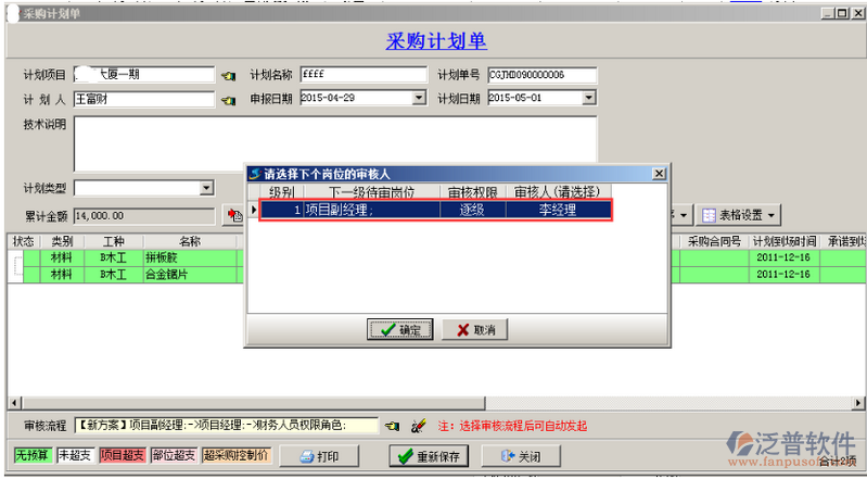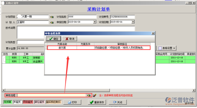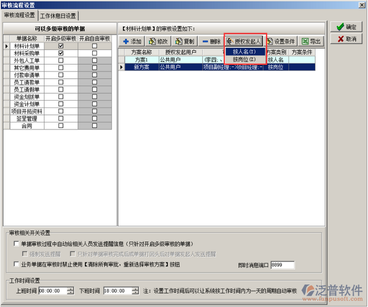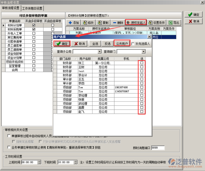 崗位角色以及用戶添加完成之后分別授權(quán)給相應(yīng)的用戶(數(shù)量或者單價),或設(shè)置審核時可修改,設(shè)置完成之后點擊“保存”的按鈕,審核方案設(shè)置完成之后則授權(quán)發(fā)起人(按人名或者按崗位),在授權(quán)用戶的復(fù)選框內(nèi)打勾即可,如果授權(quán)給“公共用戶”則在“公共用戶”的復(fù)選框內(nèi)打鉤,被授權(quán)的用戶可在創(chuàng)建單據(jù)的時候選擇多級審核方案,如圖: