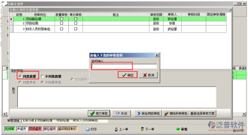 審核人審核時,選擇“我的審核”的選項,并輸入審核密碼,點擊“確定”按鈕,選擇下一位審核人,此時單據(jù)的審核狀態(tài)是“審核中”,如圖所示: