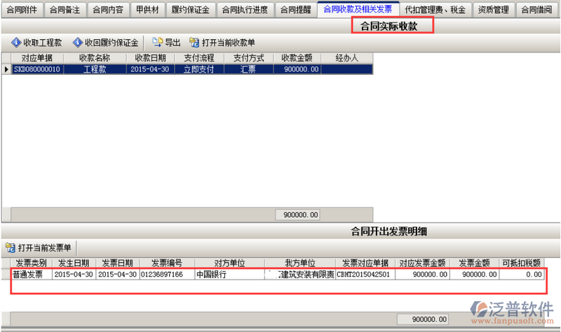 完成之后可在合同收款中看到發(fā)票的明細(xì),如圖: