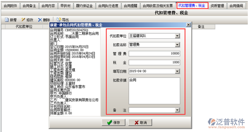 代扣管理費(fèi)稅金扣除的是我方借別的公司的資質(zhì)扣除的費(fèi)用,根據(jù)發(fā)票金額扣除的費(fèi)用稅金以及罰款以外的扣款。選中承包合同,點(diǎn)擊“代扣管理費(fèi)、稅金”如圖: