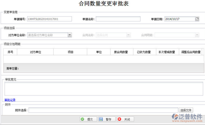 通過功能菜單【成本管理—勞務(wù)管理—勞務(wù)結(jié)算—合同數(shù)量變更單】成功發(fā)起【合同數(shù)量變更單】流程后,加載出“合同數(shù)量變更審批表”,如下圖所示: