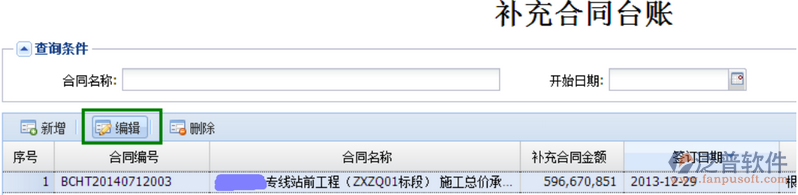 【編輯】:在臺(tái)賬頁面,選中某條補(bǔ)充合同后,點(diǎn)擊【編輯】按鈕,對補(bǔ)充合同信息進(jìn)行維護(hù)。