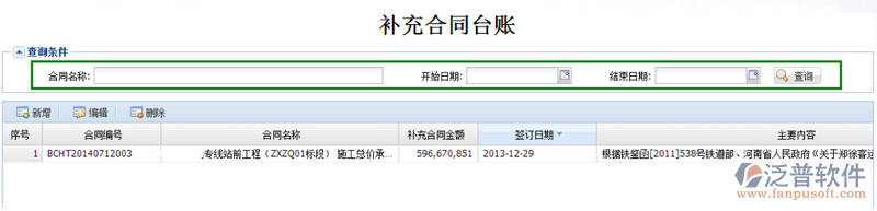 注意:在臺(tái)賬界面,可以設(shè)置查詢條件,查詢出符合條件的補(bǔ)充合同記錄。