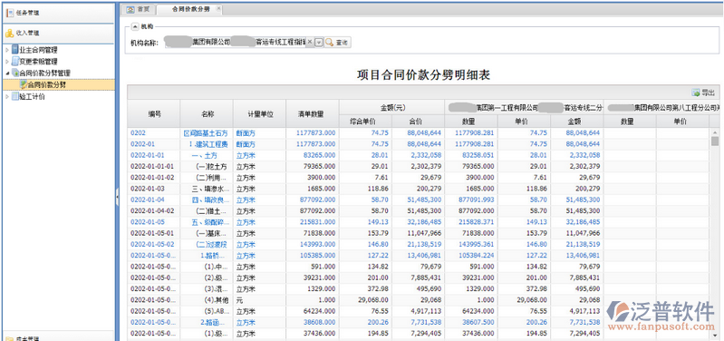 通過點擊功能菜單【收入管理—變更索賠管理—合同價款分劈管理—合同價款分劈】進入變“項目合同價款分劈明細表”頁面,如下圖所示: