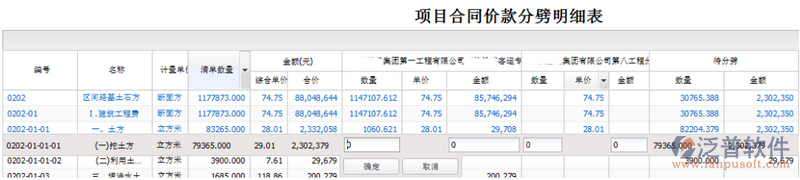 c) 當“數(shù)量”和“金額”都填寫為正數(shù)時,點擊【確定】后,單價為計算值,計算公式為:【“分部—金額”/“分部—數(shù)量”】;