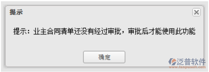 1. 在進行合同價款分劈之前,必須將清單審批完成,詳見6.2.1.4,如果未審批完成,則會出現(xiàn)以下提示信息: