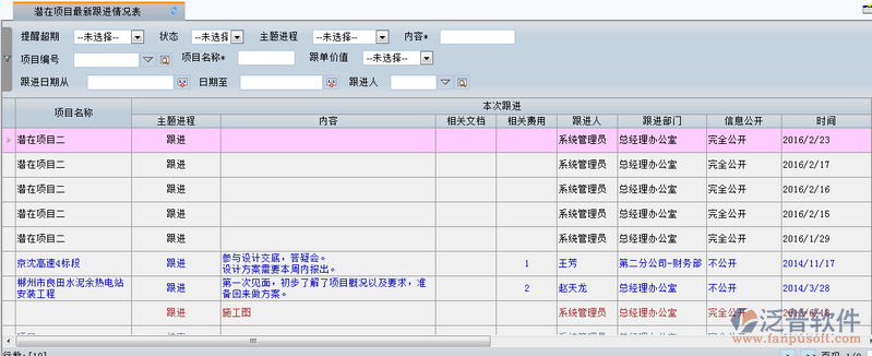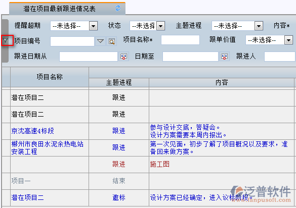 3、通過主界面中的檢索條件,用戶可快速查詢到相關(guān)的項目跟進信息。同時可多條件或單個條件進行檢索。如圖: