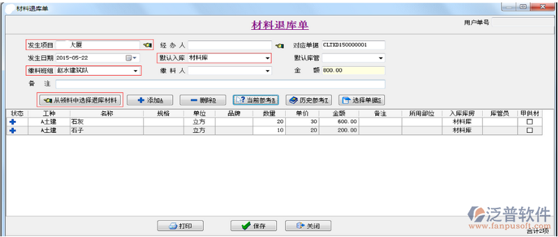 說明:該單據(jù)的功能界面類似【材料出庫(kù)單】,只不過本單據(jù)是記錄的退料的過程,具體操作可以參考【材料出庫(kù)單】。