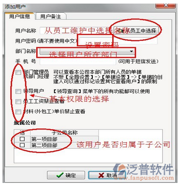 點(diǎn)擊添加用戶,在彈出的窗口中,依次添加好用戶信息,主要包含用戶名、密碼、所屬部門(mén)、所屬公司等。