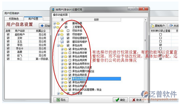 點(diǎn)擊【用戶管理權(quán)限設(shè)置】在彈出的窗口中來(lái)設(shè)置用戶操作權(quán)限。