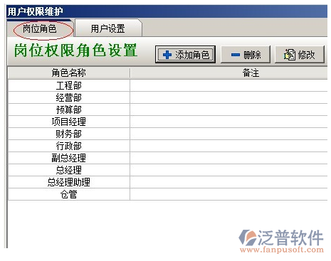 打開(kāi)用戶權(quán)限設(shè)置后,首先設(shè)置【權(quán)限角色】,下圖所示: