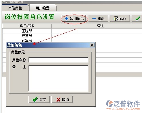按【添加角色】按鈕,在彈出的窗口中設(shè)置崗位名稱及備注說(shuō)明。