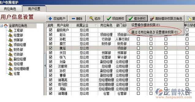 然后點(diǎn)【擊模塊授權(quán)】,選擇第一項(xiàng)【設(shè)置操作模塊權(quán)限】,在彈出的權(quán)限窗口中,對(duì)該用戶進(jìn)行授權(quán)。
