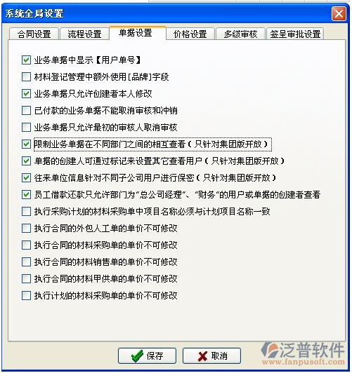(3)材料采購(gòu)單、材料銷售單、材料退貨單、外包人工單、外包機(jī)械單、運(yùn)輸車輛單、租賃結(jié)算單、其它費(fèi)用單、設(shè)備采購(gòu)單、設(shè)備維修單、設(shè)備退貨單、付款申請(qǐng)單、付款單、收款單 (涉及財(cái)務(wù)的這14個(gè)單據(jù)) 對(duì)于【財(cái)務(wù)部】也不受該條件限制,可以查看所有部門單據(jù)。