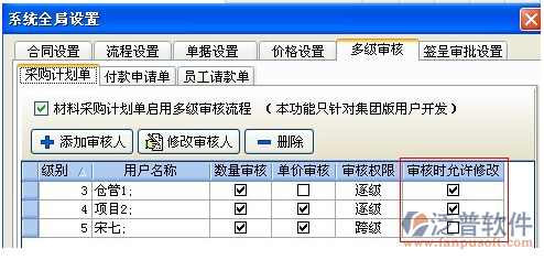 (1) 在采購(gòu)計(jì)劃單、付款申請(qǐng)單、員工請(qǐng)款單中的多級(jí)審核設(shè)置中,如下圖: