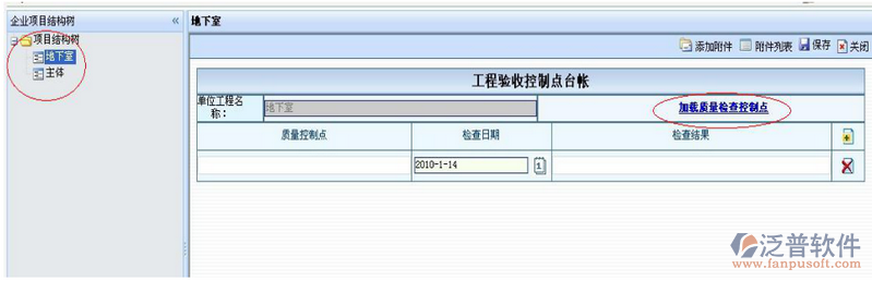 工程驗收控制點臺帳,界面如下圖所示。左邊紅色圈圈中的為項目的單體工程,此處是在項目結(jié)構(gòu)分解中分解后,此處才可調(diào)用。選擇一個單體工程,右邊對該單體工程的控制點進(jìn)行檢查結(jié)果的登記??梢渣c擊紅色圈圈中的“加載質(zhì)量檢查控制點”鏈接來調(diào)用已控制點模板,根據(jù)模板進(jìn)行相應(yīng)檢查結(jié)果登記,也可點擊檢查結(jié)果字段右邊的這個按鈕添加質(zhì)量控制點項。