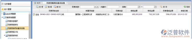 通過(guò)點(diǎn)擊功能菜單【收入管理—變更索賠管理—變更索賠項(xiàng)目基本信息】進(jìn)入變更索賠項(xiàng)目基本信息臺(tái)賬頁(yè)面,如下圖所示: