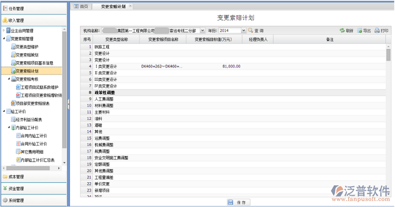 通過(guò)點(diǎn)擊功能菜單【收入管理—變更索賠管理—變更索賠計(jì)劃】進(jìn)入“變更索賠計(jì)劃”頁(yè)面,如下圖所示: