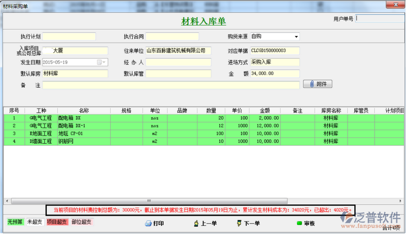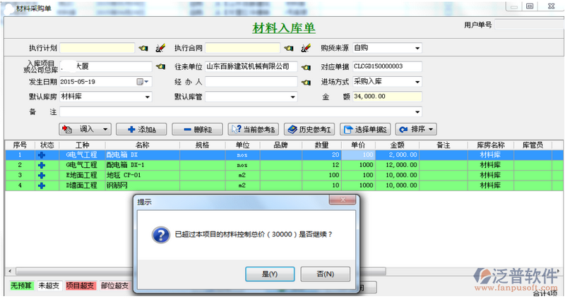 填入材料入庫單、其他入庫單成本控制金額,當超過該金額時,系統(tǒng)會自動提示。假如我們成本控制金額填入30000我們在新錄入材料入庫單、其他入庫單時超過控制金額30000會自動提示。這里咱們一采購入庫單為例,如下圖