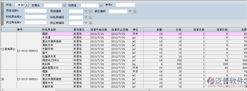 2、在主界面中,系統(tǒng)為用戶提供檢索條件查詢功能。企業(yè)可通過:狀態(tài)、項目名稱、料機具名稱、供應(yīng)商名稱等相關(guān)信息進行檢索。如圖: