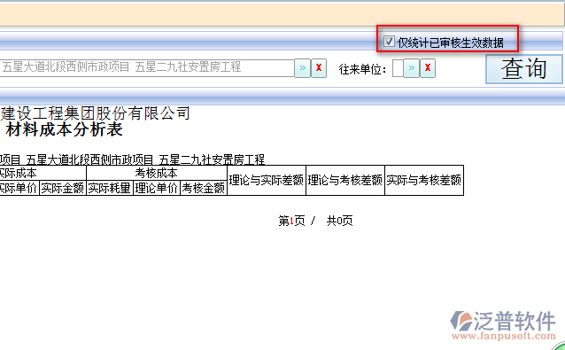 4、材料成本分析表可根據(jù)需求選擇進行顯示,可只統(tǒng)計已經(jīng)審核生效的數(shù)據(jù)或者將正在審核的數(shù)據(jù)一起統(tǒng)計到系統(tǒng)中,如圖: