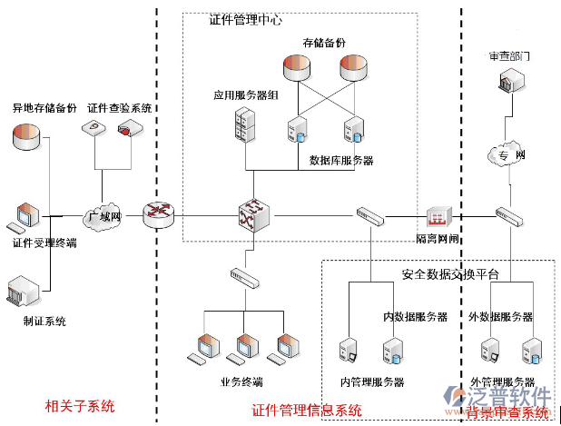 根據(jù)證件業(yè)務(wù)的結(jié)構(gòu)關(guān)系和業(yè)務(wù)流程,支撐證件管理系統(tǒng)的網(wǎng)絡(luò)環(huán)境從總體上可分為相關(guān)子系統(tǒng)部分、證件管理系統(tǒng)部門以及背景審查系統(tǒng)部門,其網(wǎng)絡(luò)環(huán)境表示如下: