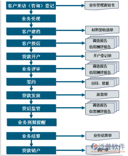 客戶(hù)檔案管理----掃描件上傳----抵押物----質(zhì)押物----保證人----聯(lián)合擔(dān)保----信用測(cè)評(píng)(企業(yè)信用測(cè)評(píng)、個(gè)人信用測(cè)評(píng))----貸款申請(qǐng)----貸款調(diào)查----貸款審查----貸款審批----合同簽署----貸款發(fā)放----發(fā)放審批----貸款展期----貸款回收----貸后跟蹤----風(fēng)險(xiǎn)預(yù)警(當(dāng)天到期貸款、即將到期貸款、逾期貸款、損失貸款提示)----財(cái)務(wù)記賬----財(cái)務(wù)出報(bào)表----報(bào)表統(tǒng)計(jì)----短信提示到期收息