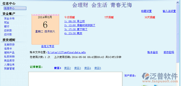 泛普財務(wù)軟件免費版特點:界面簡潔美觀,操作簡單。里面包括我的賬戶,記賬,查詢統(tǒng)計,基礎(chǔ)資料管理,以及理財資訊??梢园涯默F(xiàn)金,工資卡,各種銀行活期,定期儲蓄,信用卡,股票資金卡,借出的戶主,借來的戶主,等等幾十種財務(wù)賬戶,全部記錄在此。