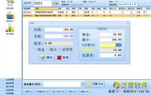 4)前臺銷售支持POS小票打印,顧顯顯示,錢箱驅(qū)動(dòng),多種結(jié)算方式