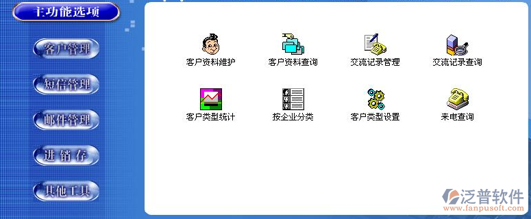 泛普軟件客戶管理系統(tǒng)泛普軟件客戶關系管理系統(tǒng)是一款專門為中小型企業(yè)營銷管理而設計的軟件。 系統(tǒng)吸取了國內(nèi)外CRM軟件的核心思路,并采納各行業(yè)眾多用戶的成功經(jīng)驗研發(fā)而成。