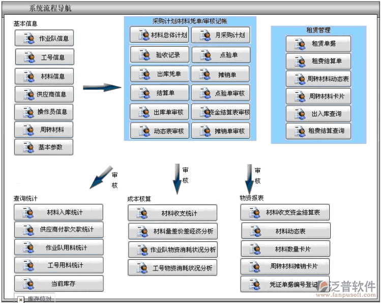 6) 租出管理:租出管理適用于企業(yè)把自己富余材料租給相關(guān)單位進行使用,從而收取租金的管理。