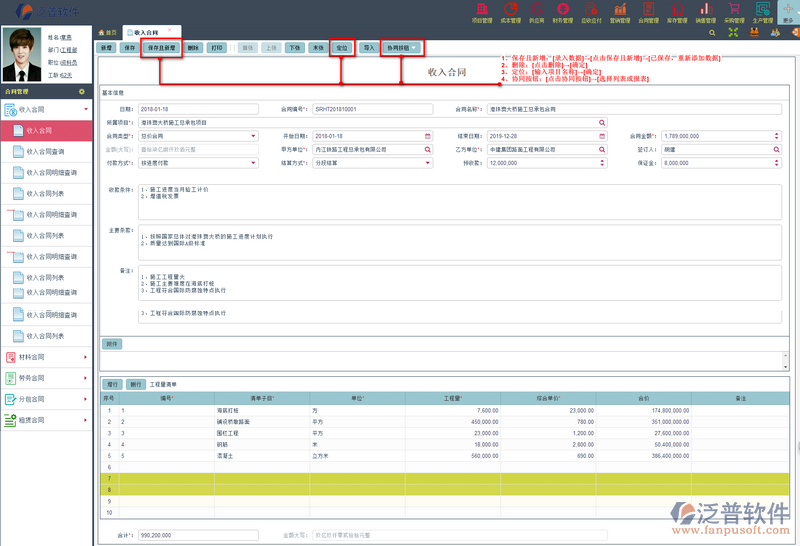 (6)、合計:將當前收入合同列表中的所有項目的收入合同金額自動匯總