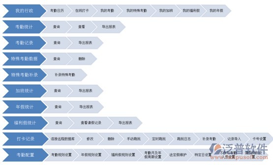 在考勤管理方面,泛普OA系統(tǒng)可能是行業(yè)內(nèi)做得最細致的。它支持六種打卡方式:考勤機、在線打卡、導(dǎo)入打卡記錄、手機考勤和補錄,支持兩種考勤模式:固定考勤和彈性考勤,支持各種假期、加班、請假、串休等管理,可以生成完整的考勤報表。下圖為OA系統(tǒng)的考勤管理功能結(jié)構(gòu),堪稱一個標(biāo)準(zhǔn)化的模板: