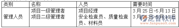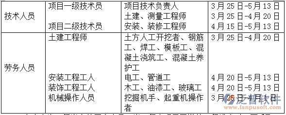 上表中為工程當中的固定人員,泛普軟件當工程出現(xiàn)需要增快工程進度時,可采取加班或者在招募一些施工人員。
