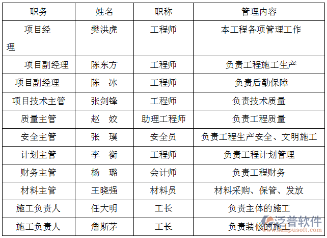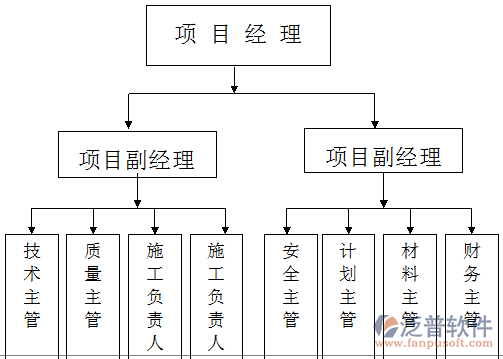 項(xiàng)目管理部組織機(jī)構(gòu)為直線管理制,根據(jù)這種管理的要求,泛普軟件-建筑施工管理軟件在項(xiàng)目經(jīng)理的選用及其他管理人員的配備上要求如下表: