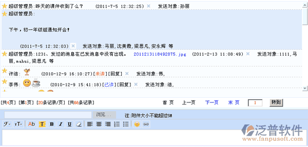 消息管理:消息管理可以發(fā)送和接受消息,消息可以上傳附件,對(duì)于發(fā)錯(cuò)的消息,有消息維護(hù)員進(jìn)行刪除和撤銷(xiāo)操作。發(fā)送的消息,發(fā)件人可以查看是否已讀情況。