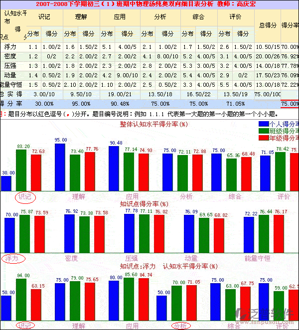 從圖中舉例的一份物理試卷的分析可知,該學(xué)生在認(rèn)知水平中識(shí)記、評(píng)價(jià)上相對(duì)比較比較薄弱;在知識(shí)點(diǎn)浮力和能量守恒上相對(duì)比較薄弱;其中浮力知識(shí)點(diǎn)上識(shí)記和分析比較薄弱。因而,教師和學(xué)生家長(zhǎng)根據(jù)學(xué)生學(xué)習(xí)過(guò)程中薄弱環(huán)節(jié),有針對(duì)性得對(duì)學(xué)生進(jìn)行輔導(dǎo),學(xué)生成績(jī)才能快速有效提高。對(duì)班級(jí)群體的診斷與分析依次類(lèi)推。