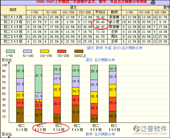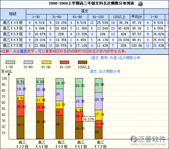 ?、谕卣狗治?mdash;群體名次頻數(shù)分析:統(tǒng)計(jì)各班不同學(xué)科在年級(jí)各名次段的人數(shù)和百分比,能夠更清楚了解各班級(jí)內(nèi)部結(jié)構(gòu)狀況。
