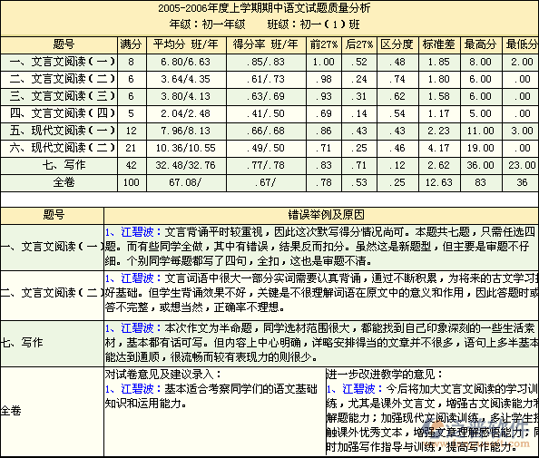 ②試卷得分率分析:通過(guò)個(gè)體和群體的得分析率分析,了解學(xué)生學(xué)習(xí)過(guò)程中和教師教學(xué)過(guò)程中的薄弱環(huán)節(jié)。從而為學(xué)生提供有針對(duì)性地教學(xué)強(qiáng)化訓(xùn)練,并為教師日常教學(xué)提供一定的參照依據(jù)。