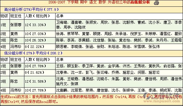 ?、弁卣狗治?mdash;群體高低組頻數(shù)分析:分析各班優(yōu)秀學(xué)生和需努力學(xué)生分布狀況,為教師選拔學(xué)科競(jìng)賽和需特別輔導(dǎo)的學(xué)生提供依據(jù)。