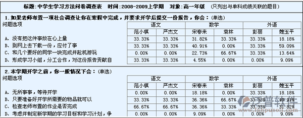 學(xué)生調(diào)查表:對(duì)學(xué)生在整個(gè)學(xué)業(yè)中有針對(duì)性的調(diào)查,探索和研究學(xué)生學(xué)業(yè)與學(xué)科及教師的關(guān)聯(lián)度。