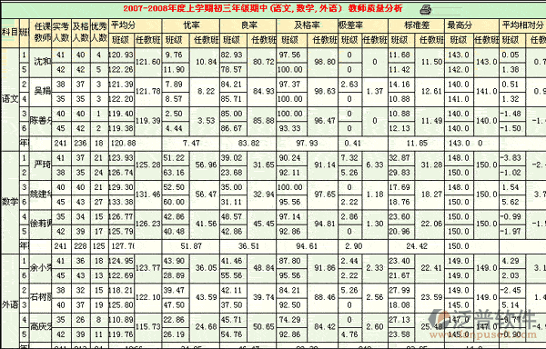 ③常規(guī)分析—教師質(zhì)量分析:分析教師所教班級(jí)各班平均分以及所教班級(jí)總體平均分優(yōu)良率、及格率和極差率,對(duì)評(píng)價(jià)老師具有指導(dǎo)意義。