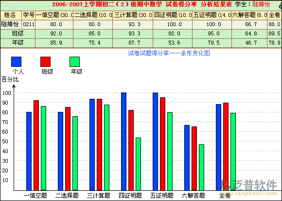 個(gè)人得分率以柱形圖反映學(xué)生個(gè)人、班級(jí)、年級(jí)各試題的得分情況